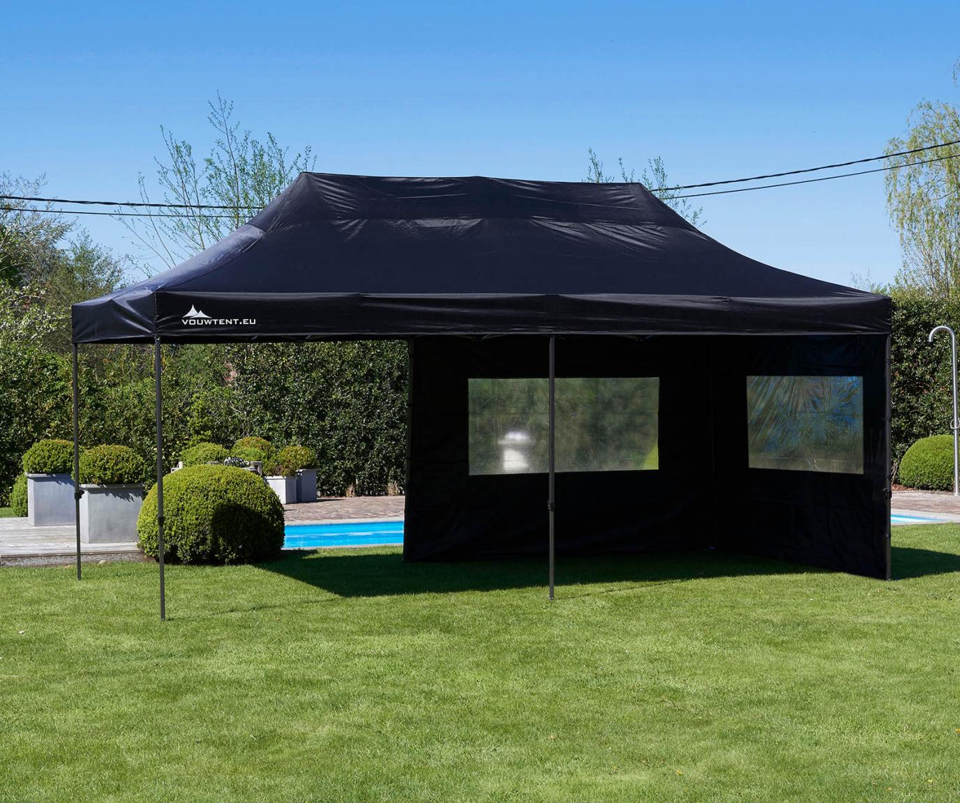 Deze vouwtent in de afmeting 3x6 meter in de kleur zwart is perfect geschikt voor feestjes, beurzen, markten en evenementen.